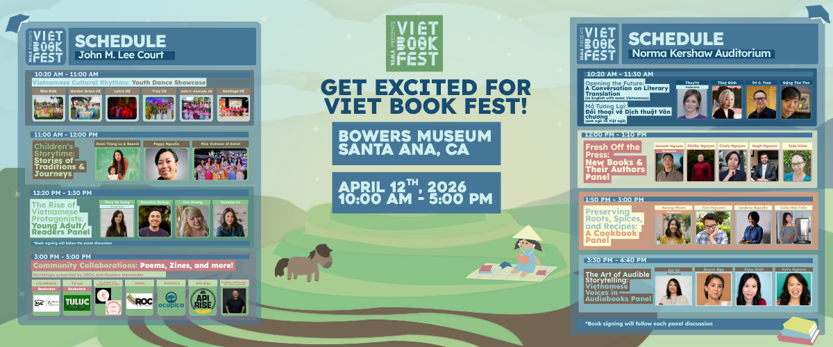 Make Art, Create Community VBF 26 - Web SliderLEARN MORE1_720Learn More13VAALA Banner 202525786VFF-Launch Event-83(1)9Web BannerLearn MoreDSC00069-EDITCaptureVFFDAY1-LN-4VFF 2016 lobby AMCVFFDAY1-LN-76Homepage_CyclesofLife1Homepage_CungTienConcert1Ambience_VietFilmFest_VAALA_masmoriya_10.8.23-14-4151204 40 Hues Exhibit-1Web page Viet Book FestLEARN MORE VAALA’s mission is to connect and enrich communities through Vietnamese art and culture Latest News Breaking Bread: Julie Mai Trần on Food, Memory, and Meaning in Vietnamese American LifeApril 15, 2026In your cookbook, you share that Mom’s Kitchen was your favorite “restaurant”, despite all that you had available growing up in Orange ... Between Languages and Histories: Thuý Đinh on Criticism, Translation, and Diasporic Vietnamese LiteratureApril 9, 2026What is your writing process like when working on essays or reviews as a literary critic? Are there certain works that you gravitate toward ... Opening the Future: Đặng Thơ Thơ on Diasporic Storytelling and TranslationApril 2, 2026The naming for the Vietnamese language panel this year is “Opening the Future,” or “Mở Tương Lai” which was a nod off your short story ... Donate nowSupport VAALA's mission to enrich communities and cultures with your tax-deductible donation. Learn More Attend an eventSearch on our calendar for upcoming arts and cultures programs and events. Learn More VolunteerSign up to volunteer with us! Learn More vaalacommunity Thank you to everyone who came out to Viet Book Fe 🙏 Thank you to our incredible community partner 🙏 A heartfelt thank you to our incredible spons Thank you to everyone who came out to Viet Book Fe Follow on Instagram Make Art. Create Community.